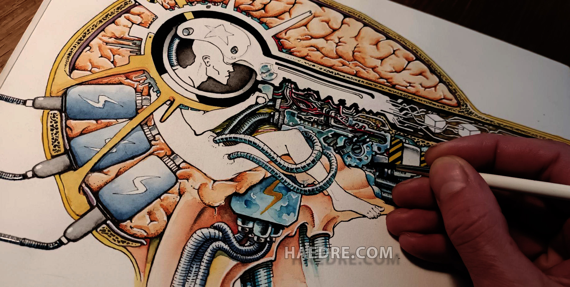 "Come and get it" aims to represent the underrated but powerful feature of Bitcoin that is to allow its user to memorize their key and thus, literally carry their wealth in their brain. It is painted with watercolour and ink on 120gr. paper. Its size is approximatively 29 x 21 cm. It was finished at block 868959.